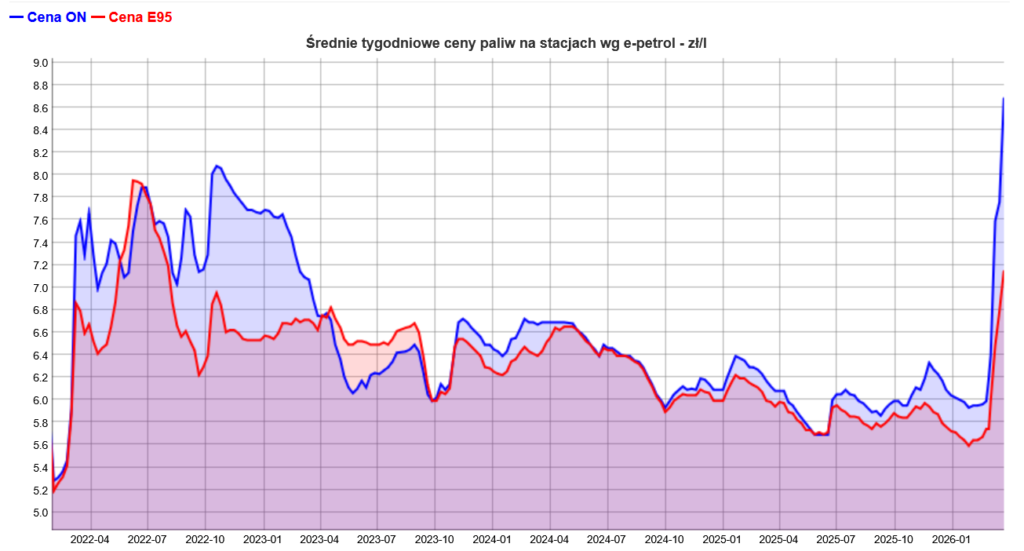 Olej napędowy (ON): 8,69 zł/l – to absolutny historyczny rekord, wyższy o 61 groszy od szczytu z 2022 roku.