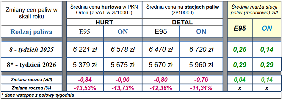Mimo dzisiejszego skoku, statystyka roczna (8. tydzień 2025 vs 8. tydzień 2026) wciąż wykazuje spadek kosztów, choć jest on obecnie dynamicznie niwelowany przez geopolitykę: