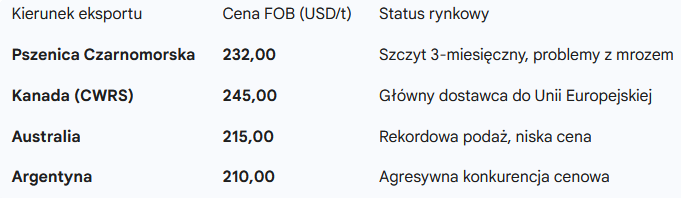 - Australia i Argentyna: Dzięki rekordowym zbiorom, te dwa kraje zalewają światowe rynki tanią pszenicą (nawet o 20 USD taniej niż ziarno czarnomorskie), blokując unijny eksport do Azji i Afryki.
