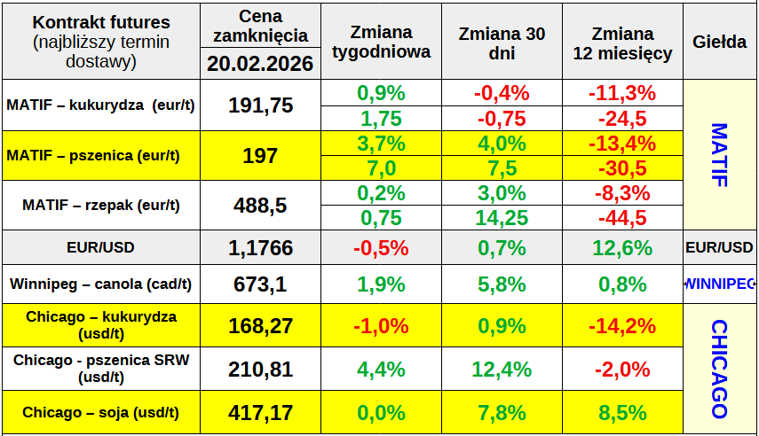 - Presja w Chicago: Mimo piątkowego odbicia o 0,41%, kukurydza w Chicago straciła w skali całego tygodnia 1,0%, zamykając się ceną 168,27 USD/t.