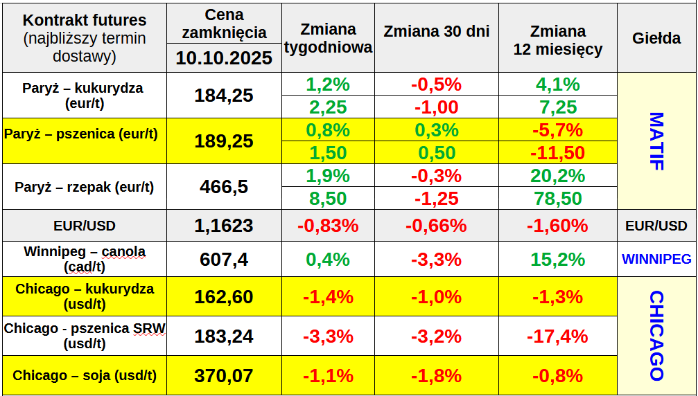 Cena pszenicy na Matif, też unijnej kukurydzy i rzepaku, spadła lekko w skali tygodnia kończącego się 10 października 2025 roku. Głównym czynnikiem prowzrostowym dla ceny pszenicy na Matif (też kukurydzy i rzepaku) był spadek wartości euro w stosunku do dolara amerykańskiego. Upadek rządu we Francji, drugiej co do wielkości gospodarki w strefie euro, osłabia wspólną walutę. Po drugiej stronie Atlantyku na ceny w Chicago prowzrostowo wpływa w październiku niepewność wynikająca z zawieszenia publikacji raportów przez USDA. Z drugiej jednak strony, świadomość rekordowej produkcja zbóż i oleistych na świecie ciąży na cenach. Dodatkowo droższy w ubiegłym tygodniu dolar oraz zaostrzenie konfliktu na linii Donald Trump – Chiny w piątek zdecydowało o spadku cen obu zbóż i soi w Chicago w skali tygodnia.