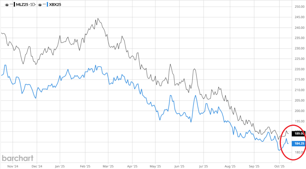 Na Matif kukurydza drożała systematycznie od 2 października do minionego czwartku (09.10.2025), a seria listopadowa odbiła z poziomu 181 eur/t (1,5-roczny dołek) do blisko 187 eur/t w czwartek. Piątkowa sesja przyniosła jednak duże spadki w notowaniach obu zbóż i oleistych po obu stronach Atlantyku. W konsekwencji notowania kukurydzy cofnęły się do 184,25 eur/t, co pozwoliło odnotować wzrost tygodniowy na poziomie 2,25 eur/t (1,2%). Wsparciem dla cen kukurydzy na Matif był wzrost notowań USD, czyli także importowanej do UE kukurydzy.