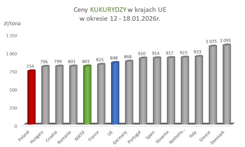 - Kukurydza sucha: Zanotowała tygodniowy spadek o 1,2%. W porównaniu do średniej unijnej (848 zł/t), nasze ziarno jest tańsze o ponad 100 zł na tonie.
