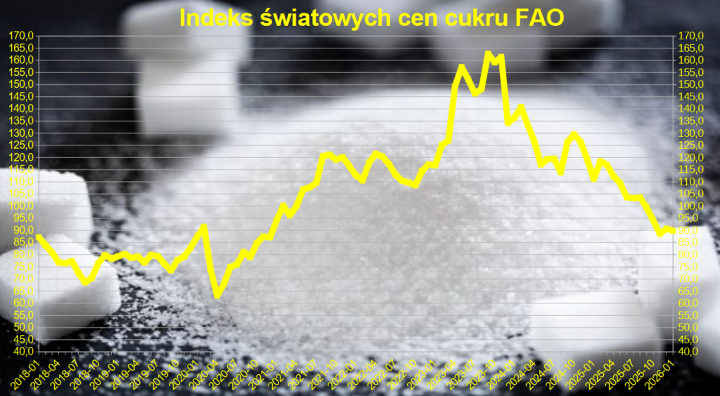Najnowszy raport Organizacji Narodów Zjednoczonych ds. Wyżywienia i Rolnictwa (FAO) z lutego 2026 roku nie pozostawia złudzeń co do kondycji rynku. Światowy indeks, monitorujący ceny cukru, spadł w styczniu do poziomu 89,8 pkt. Oznacza to, że surowiec jest obecnie o blisko 20% tańszy niż w analogicznym okresie ubiegłego roku.