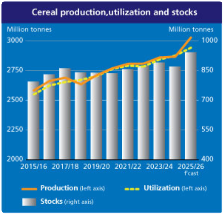 Łączny bilans wszystkich zbóż pokazuje rynkową potęgę obecnego sezonu. Przy produkcji na poziomie 3 028,8 mln ton i zapasach wynoszących 940,5 mln ton, wskaźnik stock-to-use wzrósł do 31,9%. Oznacza to, że światowe bezpieczeństwo żywnościowe jest w pełni zabezpieczone.
