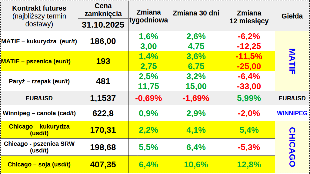 📊 Tabela: Notowania kontraktów futures – 31.10.2025 (zmiana tygodniowa/okresowa najbliższej serii)