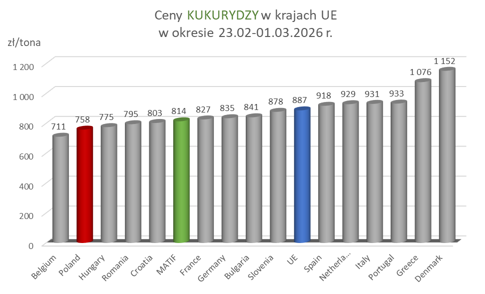 - Kukurydza: Z ceną 758 zł/t Polska oferuje drugą najniższą stawkę w całej Unii Europejskiej (zaraz po Belgii), będąc o 129 zł/t poniżej średniej unijnej (887 zł/t).