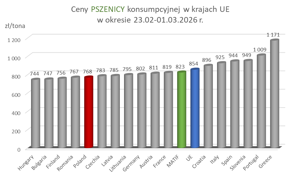 - Pszenica: Polska (z ceną 768 zł/t) jest znacznie tańsza od średniej unijnej (854 zł/t) oraz notowań na