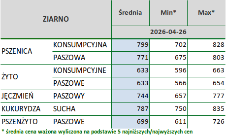 Ceny zbóż w kraju na dzień 26 kwietnia 2026 r. wykazują lekką tendencję wzrostową w niektórych kategoriach paszowych, choć ogólny rynek pozostaje pod presją globalnej nadpodaży. Mimo lokalnych wahań, oficjalne stawki zakupu są obecnie o ok. 50% niższe niż przed czterema laty, a rynek zmaga się z rekordową podażą starego surowca na świecie.