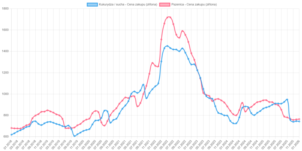 Analiza trendów od 2018 roku potwierdza, że krajowe ceny zbóż poruszają się w niemal identycznym rytmie co notowania na rynkach światowych. Obecnie w Polsce pszenica i kukurydza oscylują w granicach 750–800 zł/t, co odpowiada poziomom stabilizacji sprzed wielkich zawirowań lat 2021–2022.