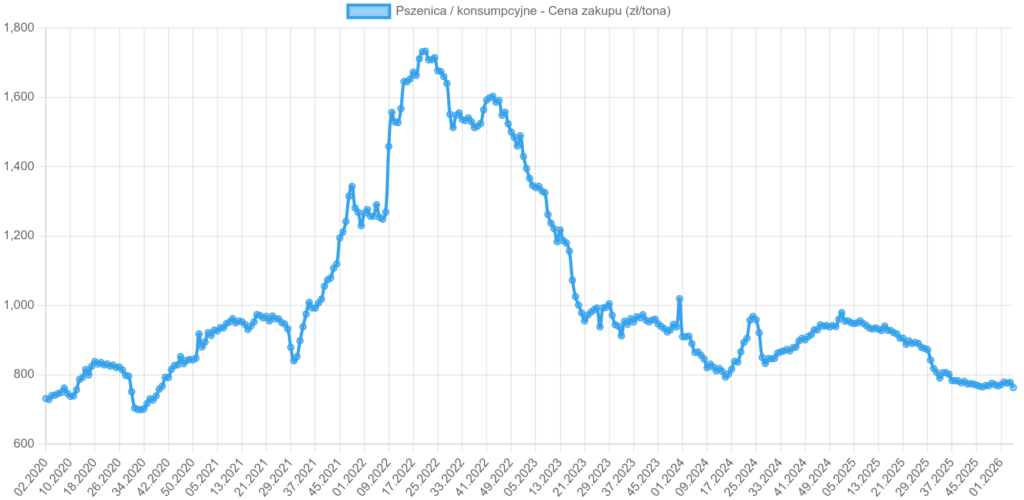Wykres: Cena średnia pszenicy konsumpcyjnej (2020–2026)