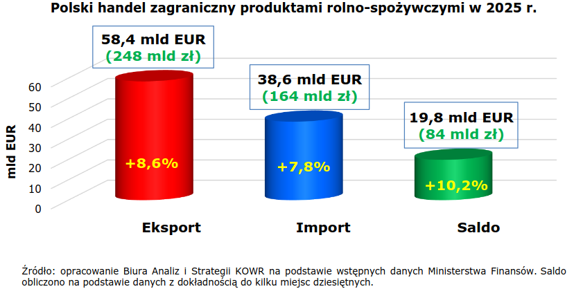 Eksport polskiej żywności osiągnął w 2025 roku historyczne maksimum, przekraczając barierę 58,4 mld EUR (blisko 248 mld zł). Według najnowszego raportu Biura Analiz i Strategii KOWR, wartość sprzedaży zagranicznej naszych towarów wzrosła o 8,6% w skali roku. Jednocześnie import rósł wolniej (+7,8%), osiągając 38,6 mld EUR, co pozwoliło wypracować rekordowe dodatnie saldo wymiany handlowej na poziomie 19,8 mld EUR (84 mld zł).