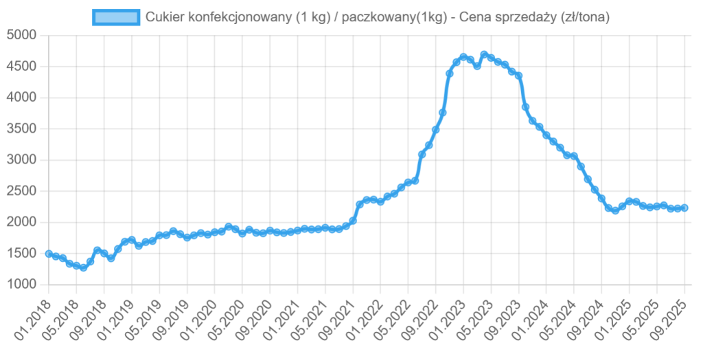W Polsce, mimo światowego trendu spadkowego, ceny cukru raportowane przez MRiRW (wykres poniżej) pozostawały do września relatywnie stabilne (na wrześniu kończą się dane MRiRW). Jednak globalna nadpodaż utrzymuje się, a uaktualnione raporty MRiRW zapewne pokażą spadek cen cukru także w kraju.