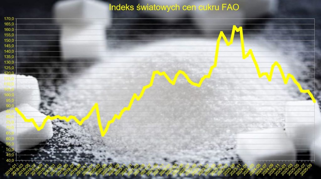 Wskaźnik międzynarodowych cen cukru FAO wyniósł w październiku 94,1 punktu, co oznacza spadek o 5,3 punktu (–5,3%) w porównaniu z wrześniem.