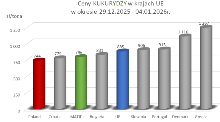 - Ceny poniżej kosztów: Średnia cena kukurydzy suchej w Polsce to ok. 743 zł/t, podczas gdy średnia unijna wynosi ok. 885 zł/t. Polska jest obecnie jednym z najtańszych rynków zbożowych w całej Unii.
