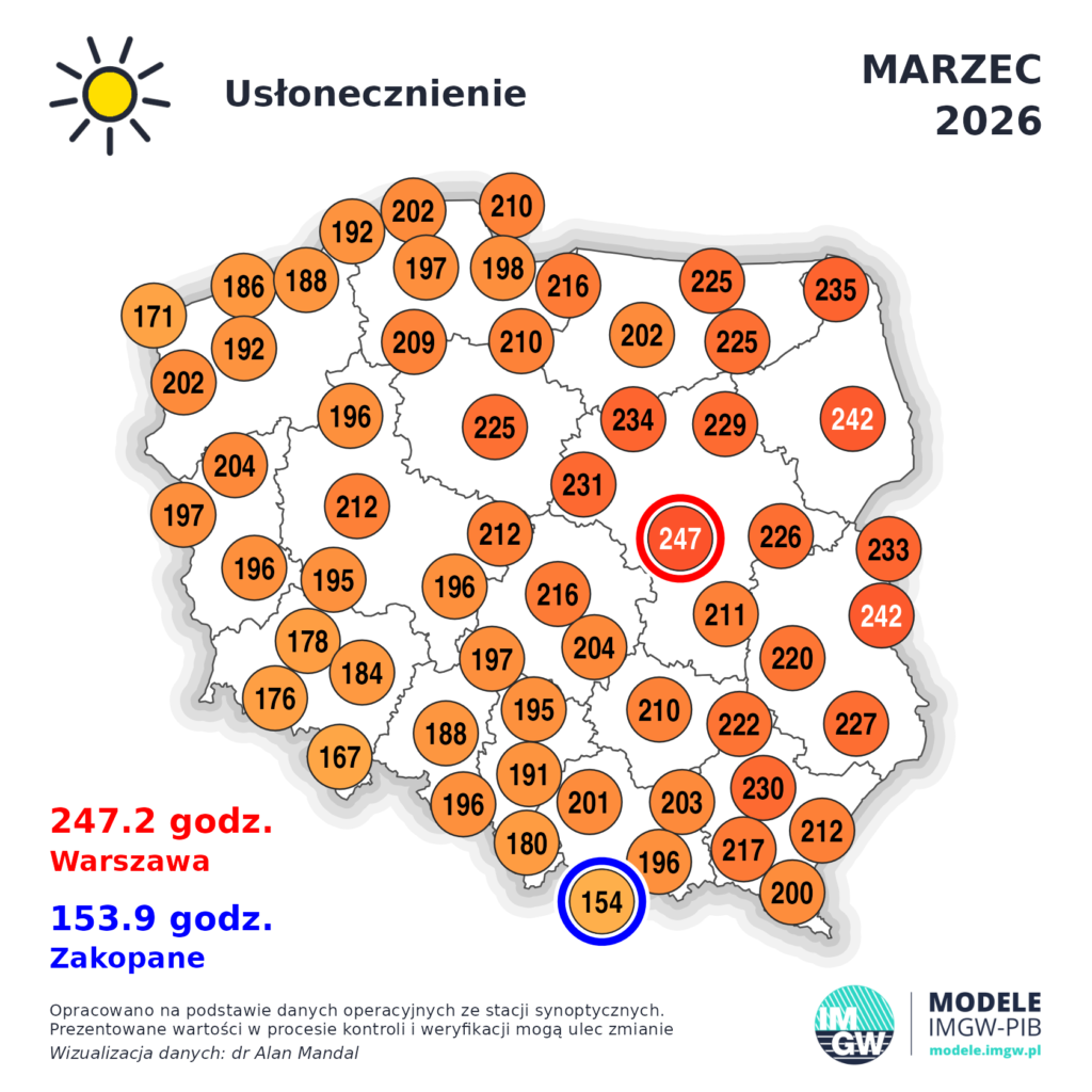 Najczęściej, najdłużej słońce świeciło w marcu 2026 w centrum kraju i na wschodzie ale uwzględniając opad na wschodzie kraju to największe parowanie mieliśmy między Koninem, Płockiem, Kutnem, Łowiczem, Warszawą. Na północnym wschodzie na początku marca na polach leżał jeszcze śnieg więc on też wpłynął na większe uwilgotnienie gleby niż w innych wyżej wymienionych regionach.