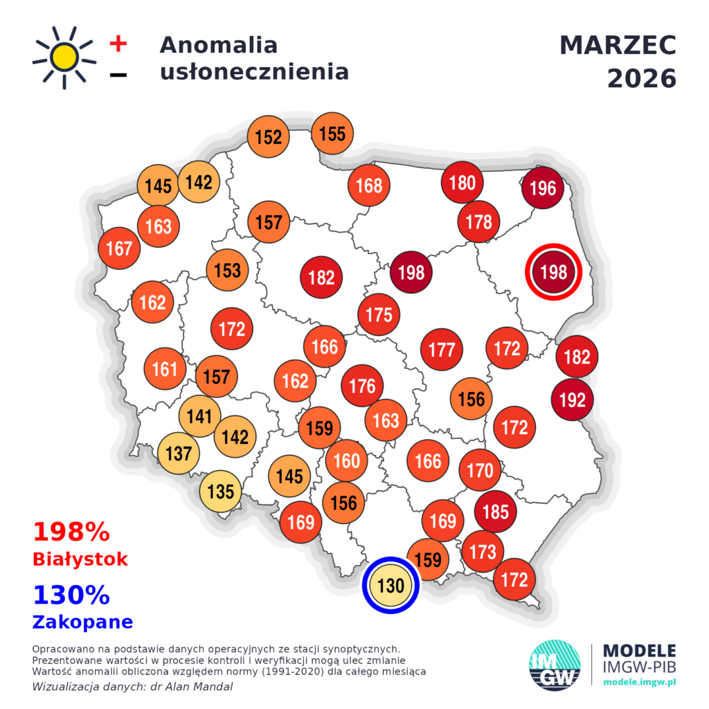 Anomalia usłonecznienia- 100% to norma. Tutaj nie dość, że marzec był suchy, ciepły to jeszcze w wielu regionach rekordowo słoneczny. Np. w Warszawie czy Białymstoku był to najbardziej słoneczny marzec od 1951 roku.