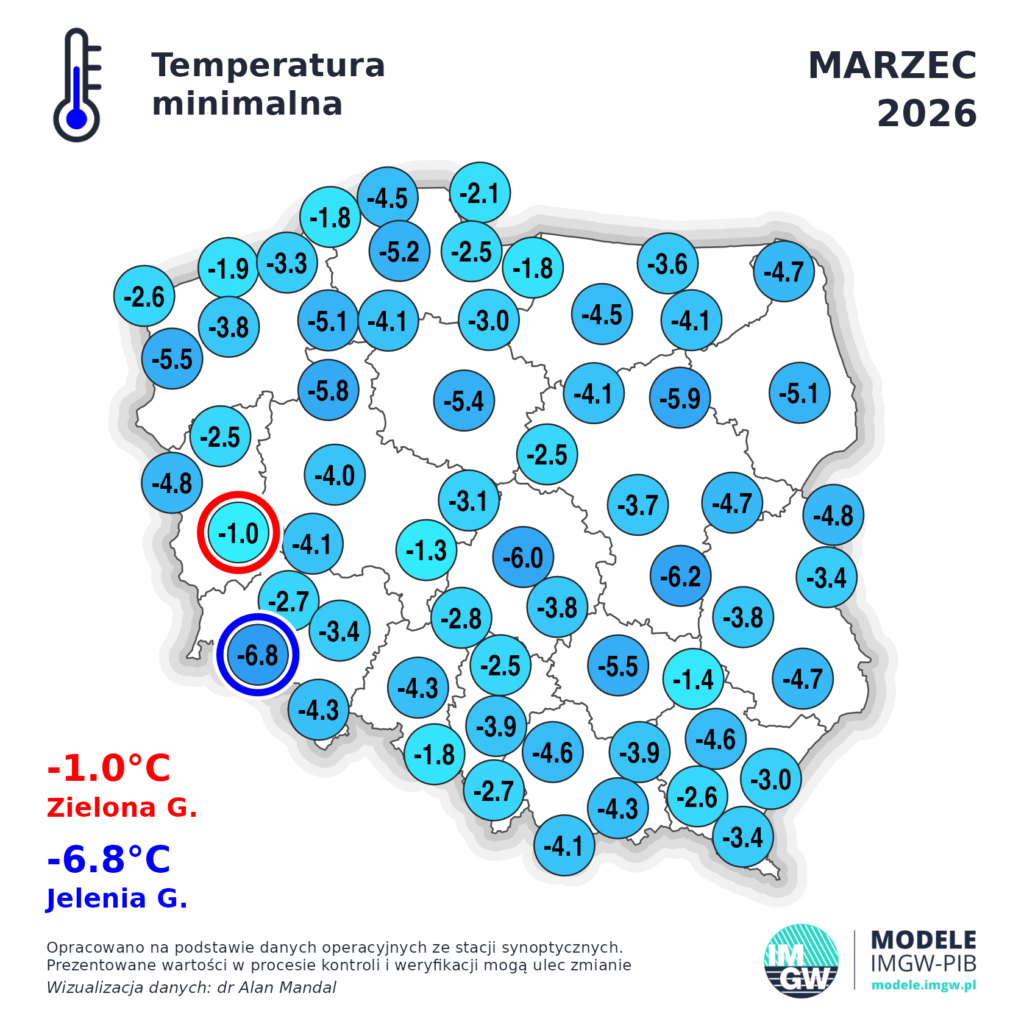 Najniższe temperatury jakie zostały zmierzone o poranku w marcu. Notowaliśmy głównie większe przymrozki, których przyczyną była nie tyle adwekcja powietrza z północy a bardzo przesuszona gleba i mała ilość drzew. Zielona Góra była najcieplejsza nocami. Dlaczego? Miasto i wiele wsi na Ziemi Lubuskiej otoczona jest lasami a lasy jak wiadomo nie tylko trzymają dłużej wilgoć ale i zmniejszają amplitudy temperatur- są mniejsze różnice między nocami a dniem. Najzimniej na nizinach było w Łodzi- aż -6 stopni na 2 metrach. Stacja znajduje się w pobliżu źródeł rzeki Ner, gdzie nie ma lasów a są głównie pola uprawne.