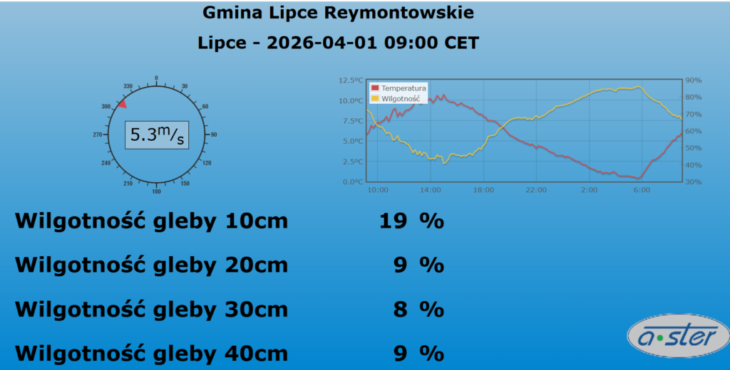 Miejscowość leży w województwie Łódzkim w cieniu opadowym Wzniesień Łódzkich- suma opadów w marcu wyniosła tutaj zaledwie 1,5 mm przy rekordowym usłonecznieniu i silnych wiatrach. Jak widać wilgotność gleby wskazuje tutaj na skrajną suszę dla roślin. Korzenie w warstwie 20-40 cm nie mają praktycznie dostępnej wody dla roślin. Jest to jeden z pierwszych regionów w Polsce, który stepowieje a przedłużająca się susza na kwiecień może okazać się dla tego regionu finansową katastrofą.