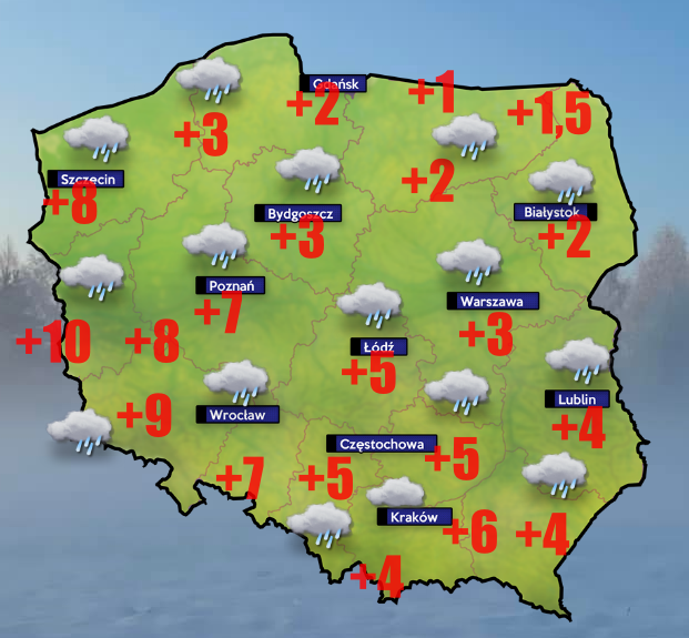 Najbliższej nocy niebo przeważnie pochmurnie ze słabymi opadami przelotnej mżawki. Na termometrach od 0 stopni między Puckiem a Wejherowem oraz miedzy Suwałkami a Ełkiem do 1-2 stopni na Kaszubach, Żuławach, Podlasiu, Kurpiach i Warmii. Na wschodzie, południu i w centrum do 2-4 stopni na plusie a na zachodzie kraju nie mniej niż 4-6 stopni powyżej zera.