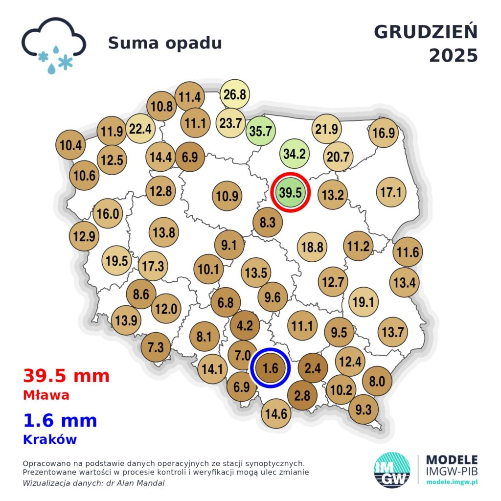Grudzień zapisał się jako miesiąc bardzo suchy. W Małopolsce praktycznie nie padało wcale- w Krakowie zanotowano aż 1,6 mm za cały miesiąc. Najwięcej wody spadło w wąskim pasie ostatnich śnieżyc.