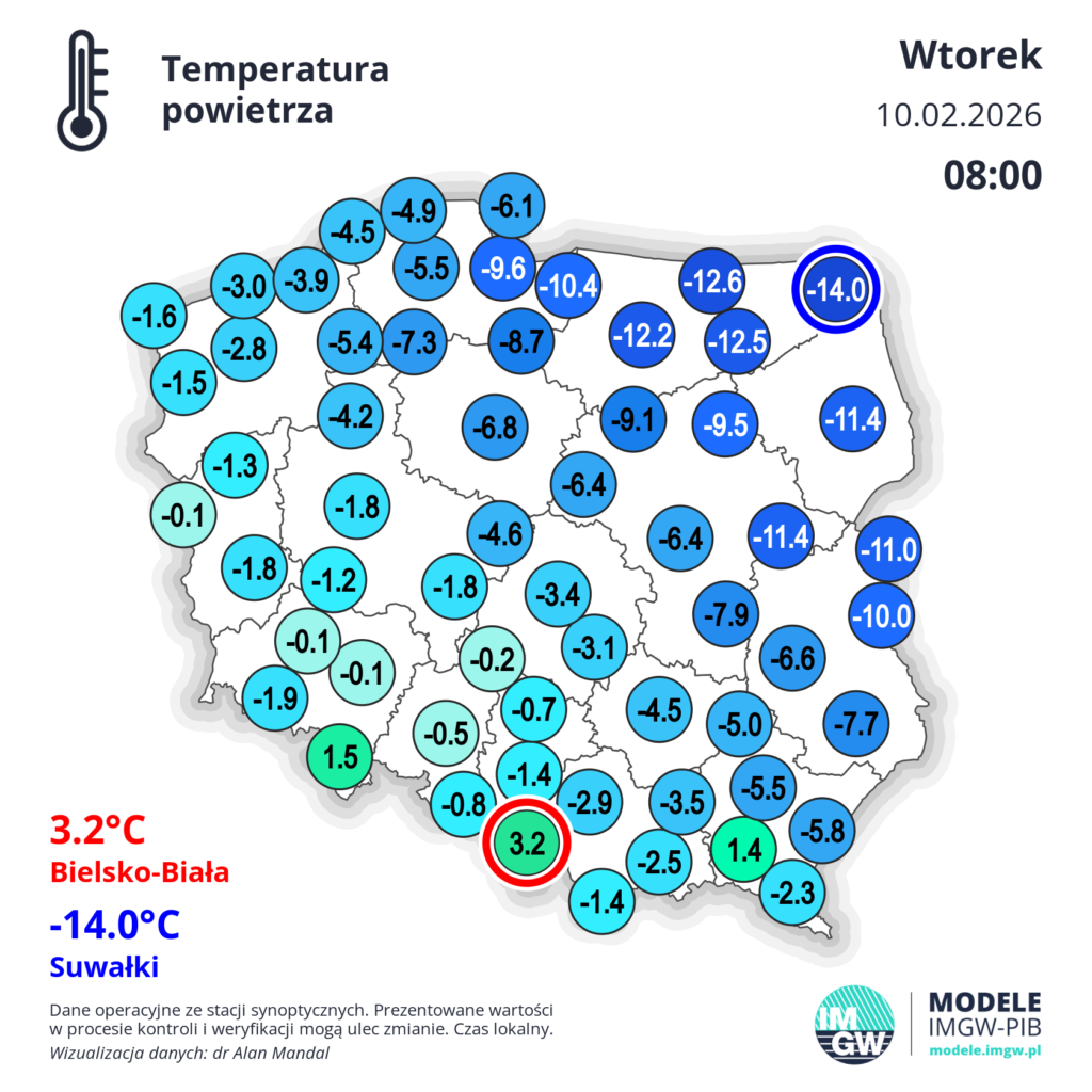 Najbliższej nocy temperatura wyniesie od -5 stopni na Suwalszczyźnie i -3/-1 stopień od Kaszub po Kurpie i południowe Podlasie do 0/+1 stopnia na zachodzie, południu, w centrum oraz w woj. Lubelskim i na zachodzie Pomorskiego. Lokalnie w regionach podgórskich jak np. w Bielsku Białej; Makowie Podhalańskim czy Nowym Sączu możemy mieć +5 stopni.