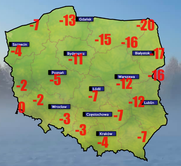Padać nigdzie już nie będzie. Na termometrach od -11 stopni w Sejnach i Hajnówce do -10 w rejonie Kartuz, Suwałk i Wejherowa do aż +2 w Zgorzelcu, Bogatyni i Jeleniej Górze.