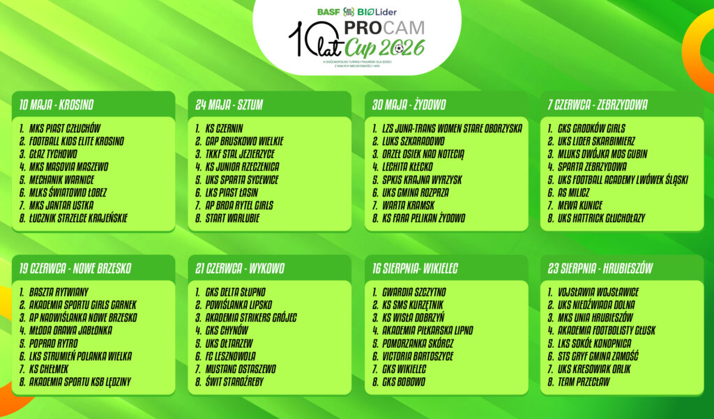 Tegoroczna edycja ma wyjątkowy charakter, ponieważ turniej świętuje 10-lecie istnienia. Organizatorami PROCAM CUP 2026 są PROCAM, BASF Polska, BIO-GEN oraz BIO-LIDER, a wydarzenie odbywa się pod honorowym patronatem Polskiego Związku Piłki Nożnej.