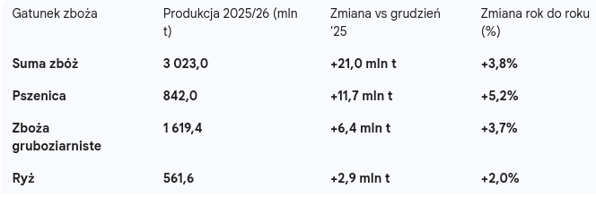 Najnowszy raport FAO z 6 lutego 2026 r. wskazuje na bezprecedensową podaż. Światowa produkcja zbóż ma wynieść 3 023 mln ton. To nie tylko wzrost o 3,8% w ujęciu rocznym, ale przede wszystkim wyraźna korekta kursu względem ostatnich szacunków z końca ubiegłego roku.