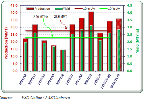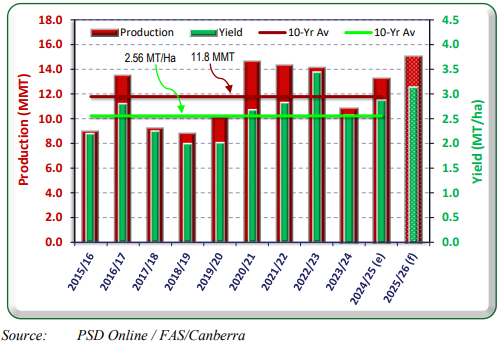 Sprzyjająca pogoda w lipcu i sierpniu oraz opady we wrześniu i październiku w Australii Zachodniej pozwoliły na wzrost średnich plonów pszenicy o 8,5%. Pomimo zmniejszenia powierzchni zasiewów o około 3%, FAS prognozuje 36 milionów ton pszenicy, co będzie trzecim największym wynikiem w historii kraju i o 1,9 miliona ton więcej niż w roku ubiegłym.