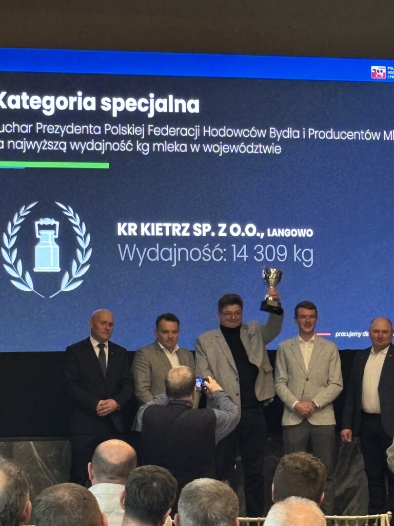 – Jestem bardzo dumny z wyników za 2025 rok. Wszystkie nasze gospodarstwa były na podium. Zajęliśmy pierwsze i drugie miejsce w kategorii od 150 do 300 krów oraz drugie miejsce w kategorii powyżej 300 krów. Dla nas jest to też o tyle istotne, że prowadzimy hodowlę holsztynofryza czerwonego, a w kategorii startowały wszystkie krowy, zarówno czarno-białe, jak i czerwono-białe. Dla nas to jest niebywały sukces. Dzisiaj średnia wydajność z naszych obór to jest powyżej 13 tysięcy. To można powiedzieć jest zaprzeczeniem, jak każdy mówi, że krowy czerwono-białe dają mniej mleka. To jest długoletnia praca całego zespołu: głównego hodowcy oraz zootechników i kierowników na fermach. Im należą się największe gratulacje.