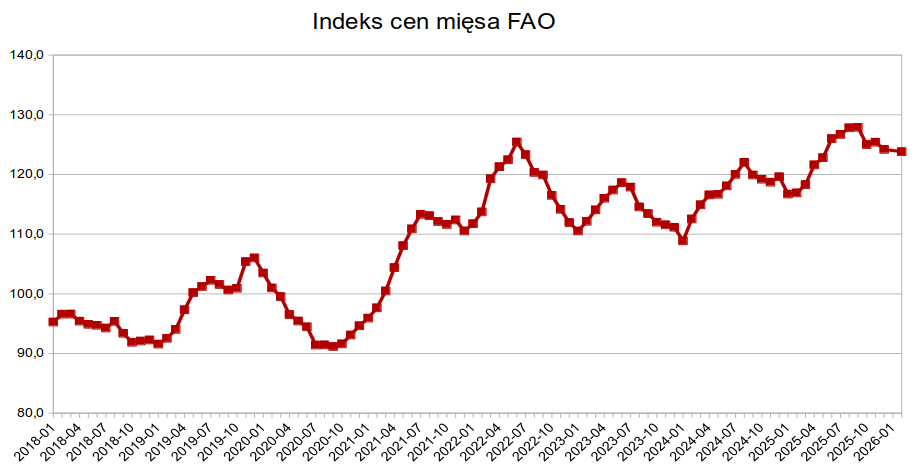 Według najnowszego zestawienia FAO, światowy indeks cen mięsa spadł w styczniu do poziomu 123,8 pkt (spadek o 0,4% m/m).