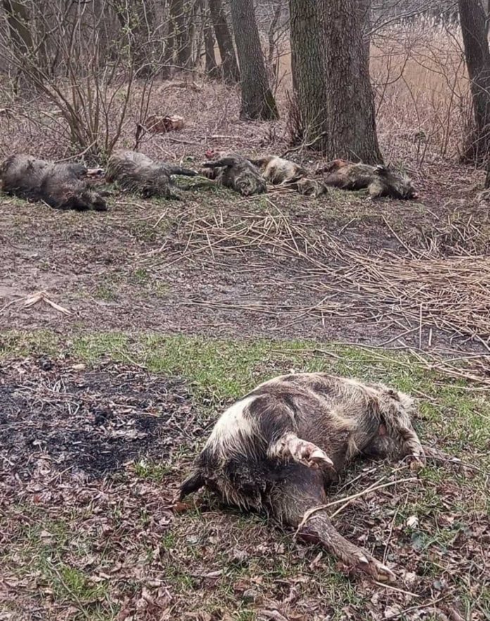 To nie jest standardowy obraz martwego dzika. Zwierzę było oskórowane, pozbawione wnętrzności, przeniesione w odludne miejsce nad Luciążą, gdzie naturalnie padłe zwierzęta się nie pojawiają. Stan tuszy wskazuje na działanie ludzi — nie natury.