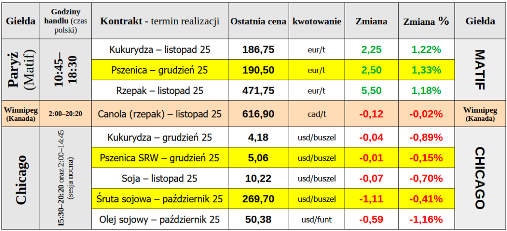 Zamknięcie czwartkowej sesji na giełdowym rynku zbóż i oleistych – 09.10.2025: