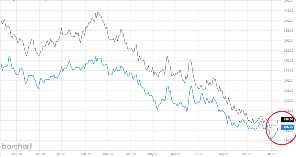 W USA krajowe prognozy wskazują na nieco niższe plony kukurydzy i soi od tych zawartych we wrześniowym raporcie USDA. Wspiera to nieco notowania obu upraw w Chicago. W przypadku amerykańskiej kukurydzy średnie oczekiwania wskazują na plony na poziomie 185 bu/akr, w porównaniu z 186,7 bu/akr w raporcie wrześniowym. Dla soi prognoza wynosi 53,2 bu/akr, co stanowi nieznaczny spadek w porównaniu z 53,5 bu/akr z poprzedniego miesiąca. Te korekty w dół częściowo wspierają ceny, choć dopiero oficjalna publikacja USDA pozwoli ocenić rzeczywistą skalę spadku plonów i zbiorów.