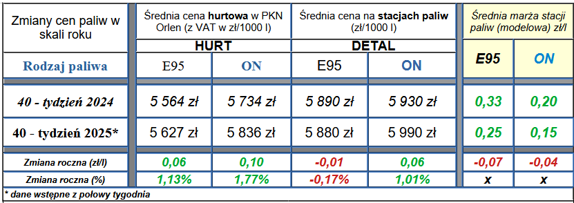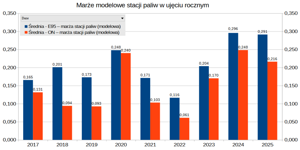 W połowie 40 tygodnia 2025 uśredniona marża modelowa stacji paliw wyniosła 15 groszy/l dla ON (-1 grosz w skali tygodnia), a w przypadku benzyny (Pb95) 25 groszy na litrze (-1 grosz w skali tygodnia).