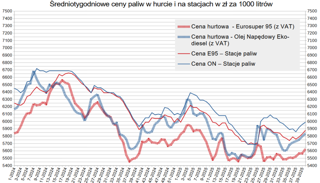 W cenniku hurtowym PKN Orlen w skali tygodnia kończącego się 1-go października 2025, cena netto litra benzyny 95 wzrosła o 5 groszy (-2 grosze tydzień wcześniej) i sięga 5,61 zł/litr (z VAT). W tym samym czasie cena diesla nie zmieniła się (również 0 groszy tydzień wcześniej) i wyniosła 5,76 zł/litr (z VAT). Oznacza to, że diesel był w środę (1.10.2025) o 15 groszy droższy od benzyny (-7groszy w skali tygodnia).
