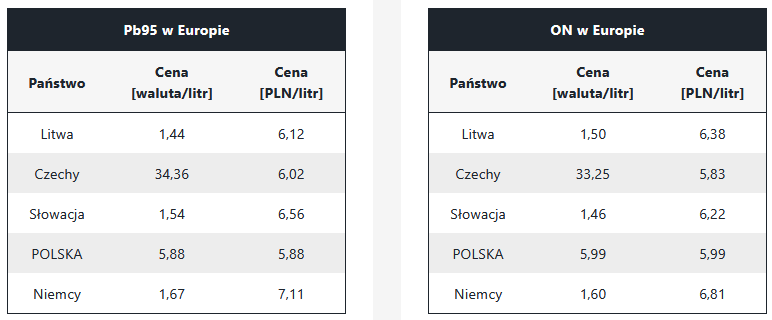 Ceny diesla i benzyny (średnie) u naszych sąsiadów (z 01.10.2025)