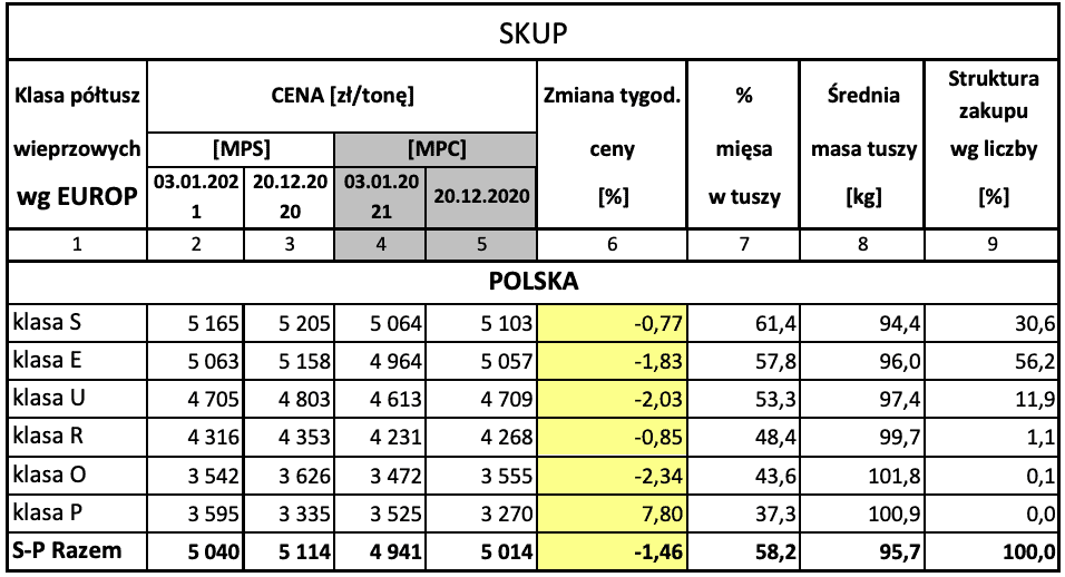 Tab. 1 Średnie ceny netto (bez VAT) zakupu świń rzeźnych wg klasyfikacji poubojowej EUROP. (masa schłodzona [MPS]; -masa poubojowa ciepła [MPC] )